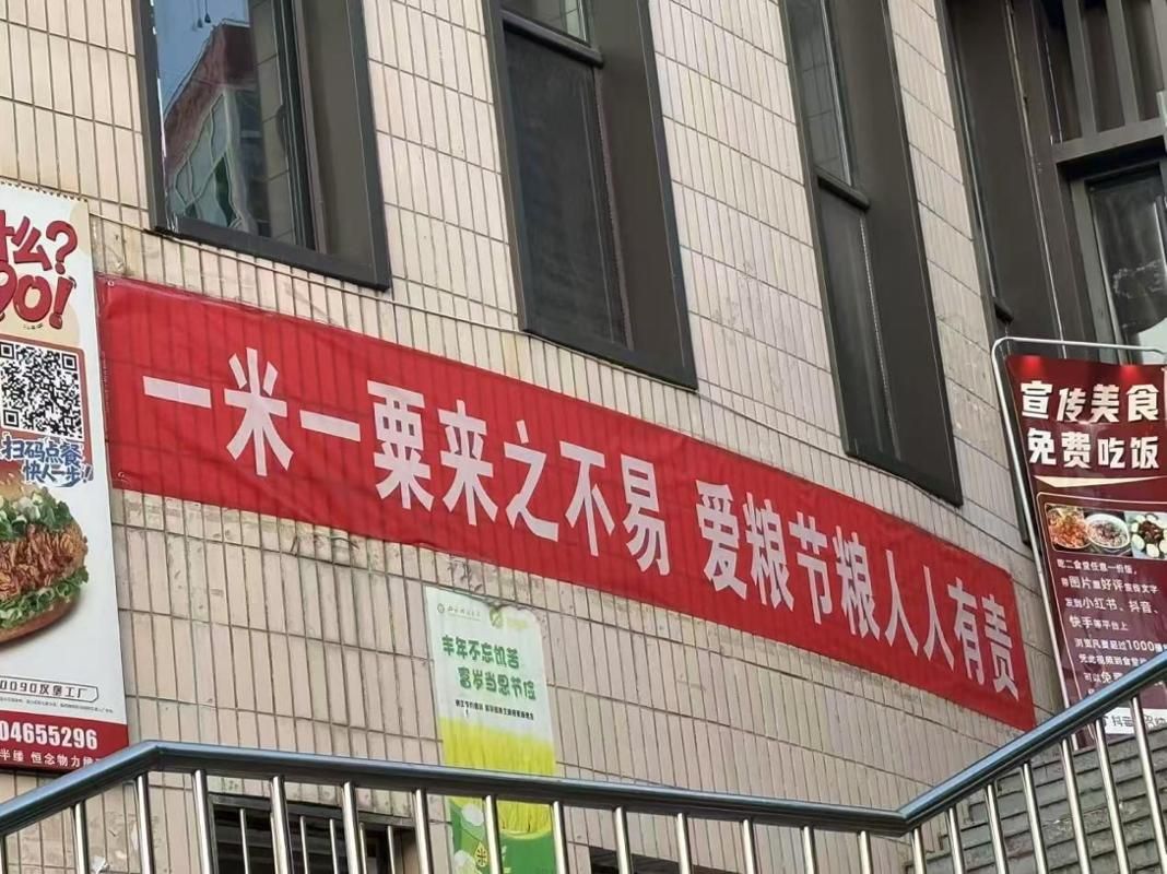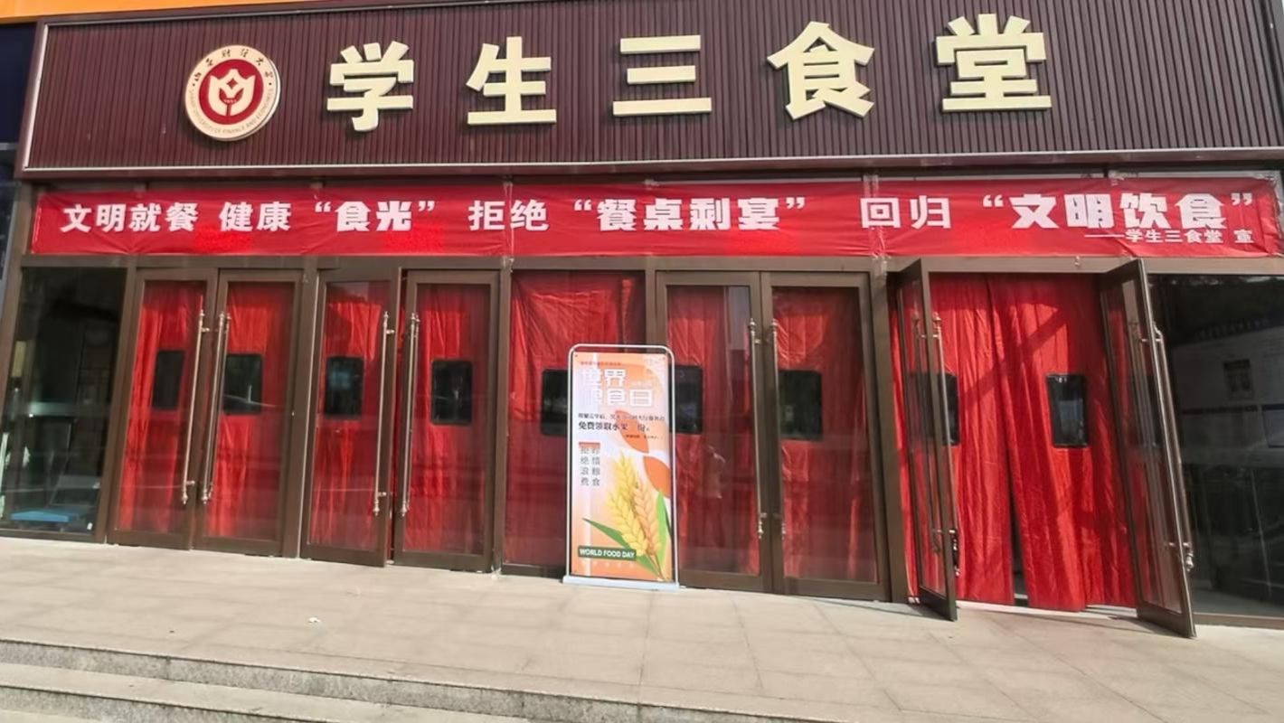 “世界粮食日”当天,各学生食堂迅速掀起节粮宣传热潮。条幅醒目悬挂、海报生动陈列、电子大屏循环轮播节粮标语。与此同时开展的“光盘有礼”活动更获学子积极响应——凡在食堂就餐实现“光盘”的同学,均可领取专属纪念品。这份小小的鼓励,有效引导大家按需点餐、杜绝浪费,让“新时代节粮先锋”的称号成为校园新风尚。